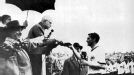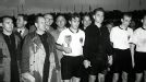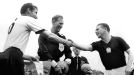 Fritz Walter (izquierda) y Ferenc Puskas (derecha) capitanes de Alemania Federal y Hungría respectivamente, se saludan antes de comenzar La Final
